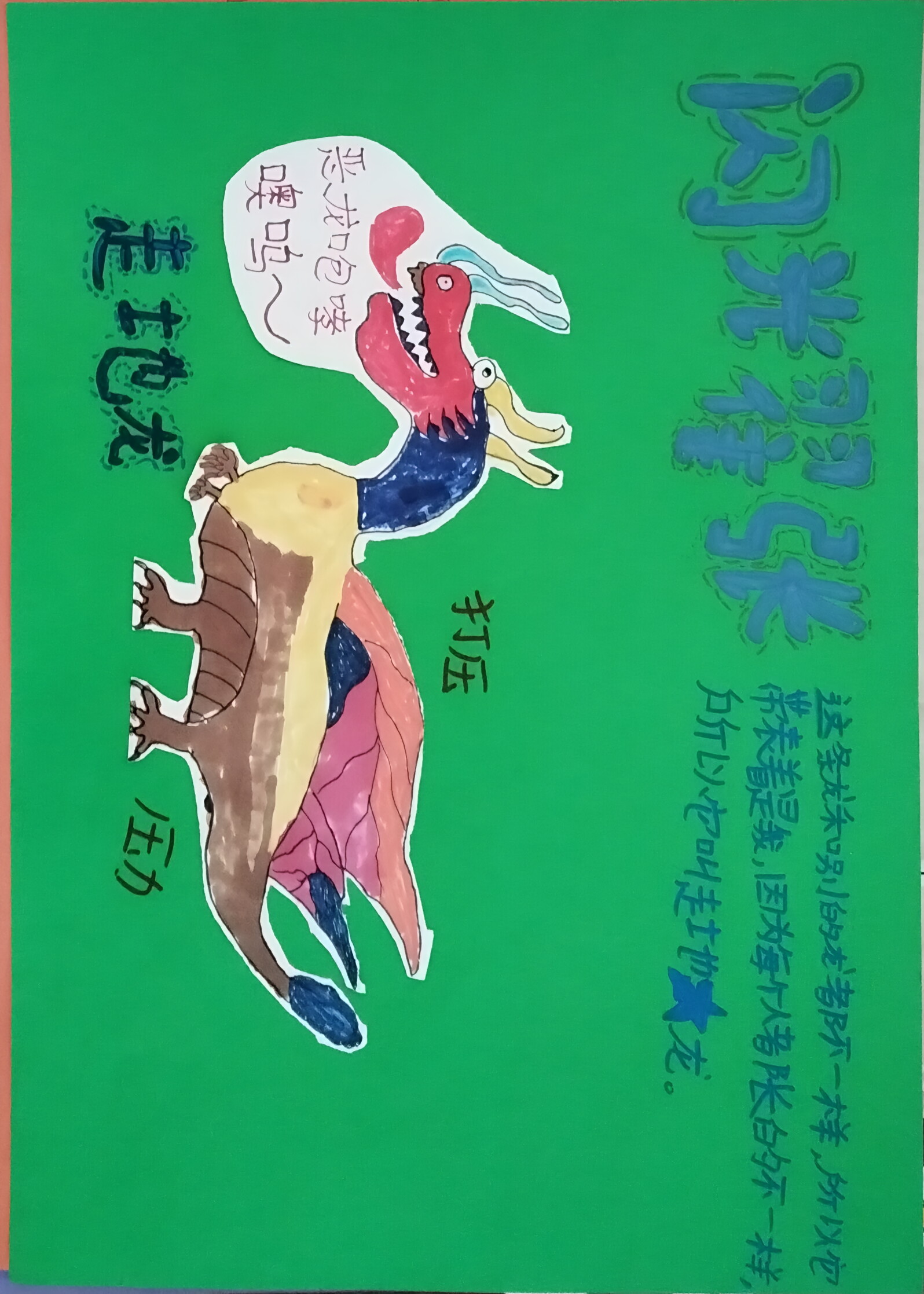 以剪贴手绘创作色彩撞色的趣味龙:红首黄身配粉翼,嘴叼 "恶龙咆哮" 气泡,搭配 "打压"压力" 的搞怪文字,又用 "因为太显眼,被当坏龙" 的反差故事,让传统威严龙变身为委屈 "显眼包"。青绿底色 + 吐槽文案,把可爱的 "社恐式显眼" 藏进生肖创意里,既保留龙的形态,又添生活吐槽趣味。