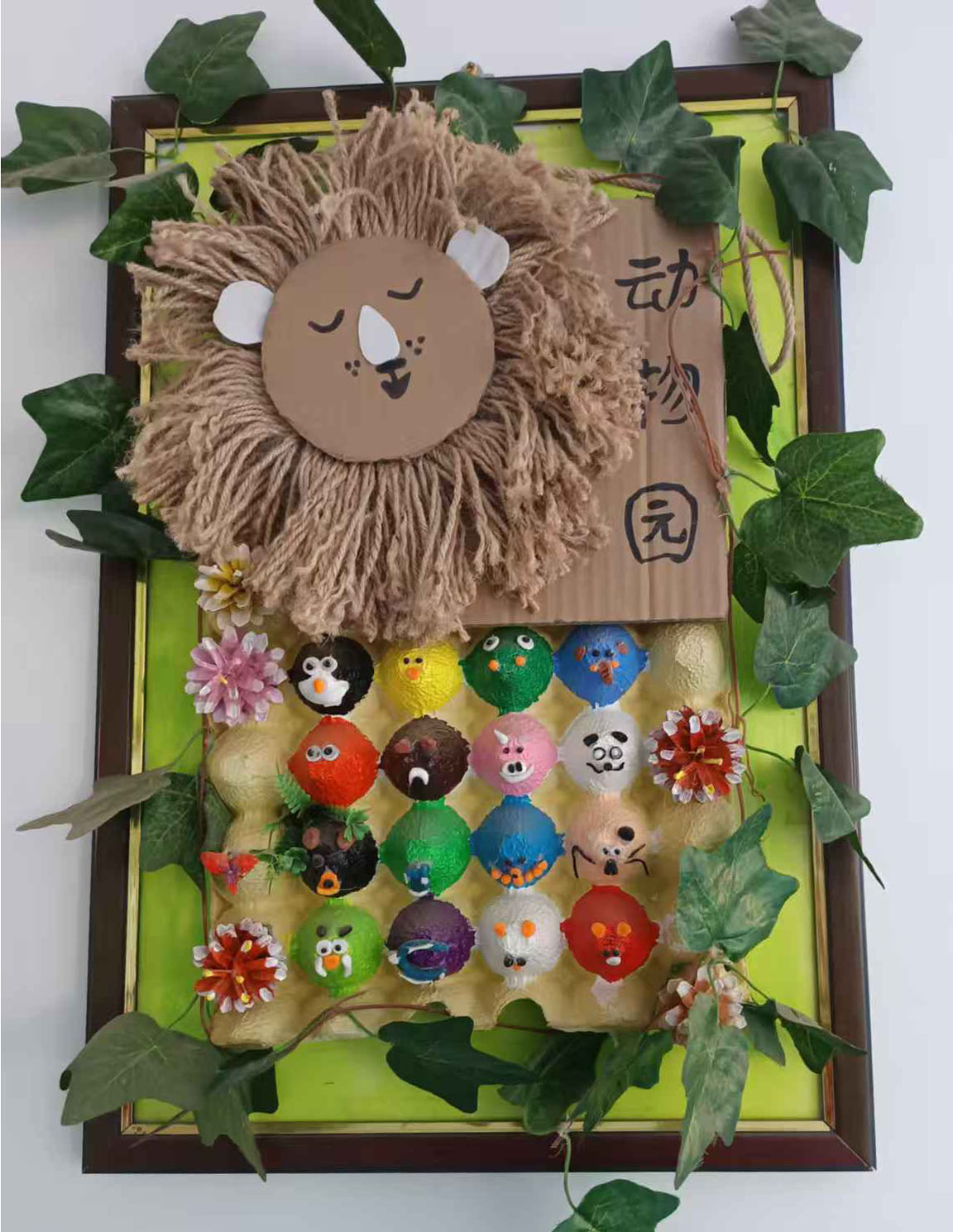 动物园的动物们又坐在一起开会了,大家争争吵吵,在选一个大王,突然高处传来一声狮子的大吼声,吵死了,能不能安静点,这不周围马上就安静了下来。动物园动物们的座次马上就排好了。 狮子大王的形象最是高大威猛就用硬纸板做出来放在最上角,然后用一些麻绳子做出威风凛凛的样子,这样动物们才会害怕他,而其它动物们都是用废鸡蛋托一个全剪出来粘贴上去,再根据他们各自的面部特点画上去,可爱的小松鼠,呆呆的大狗熊,机灵的小猴子,憨憨的野猪,酷酷的猫头鹰,萌萌的大象……栩栩如生形像可爱。 最后再弄些绿枝进行点缀一下,看上去就像是生活在大森林里的和谐温馨的一家。