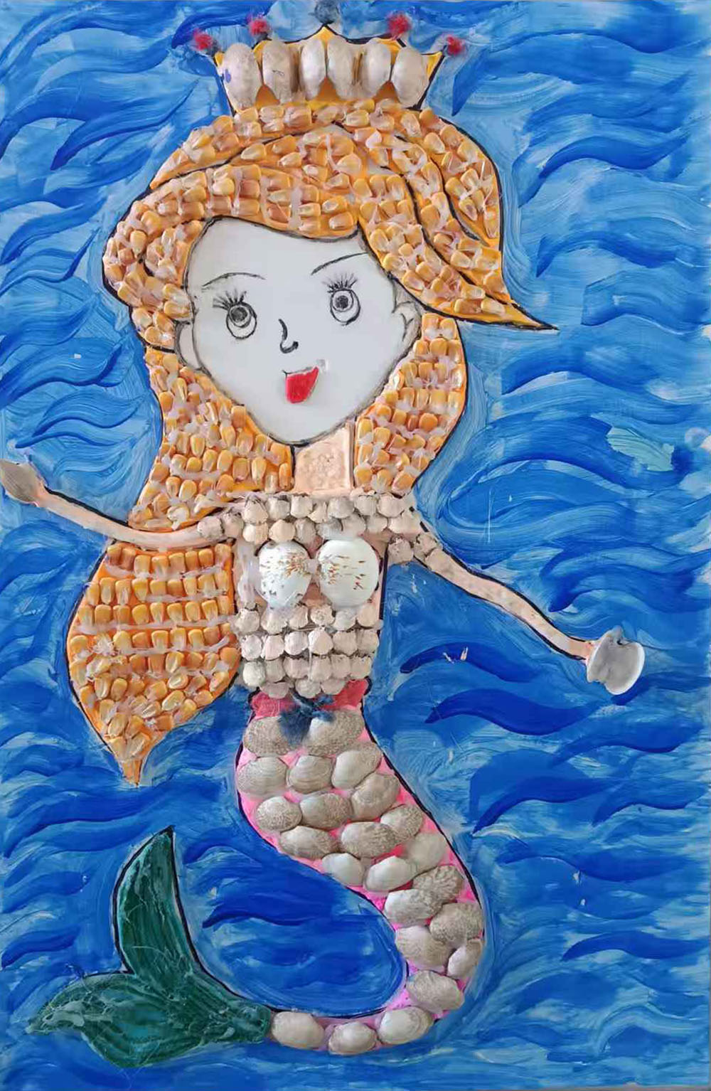 旧物利用制作手工艺品,那可是我们手工课上最常见的了,今天我就用家里的玉米粒和小贝壳制作了一个美人鱼。 这个美人鱼就生活在蔚蓝色的大海中,所以我在底色上就先画出一片蔚蓝色的大海,然后再勾勒出一条美人鱼苗条的身材,和她那精致的脸庞,那美人鱼飘逸的长发大致的轮廓也先勾画出来,然后就用玉米粒一棵一棵的粘贴上去,那金黄色的长发就在一粒粒玉米粒的粘贴中出来了,王冠是美人鱼必不可少的装饰,那妙曼的身姿我只能小贝壳一块一块去拼装上去了,有大的有小的,很快身体部分也做好了,那儿还有不足之处再进行修补一下,一个可爱的美人鱼姐姐就栩栩如生地大海中开始游曳起来了。