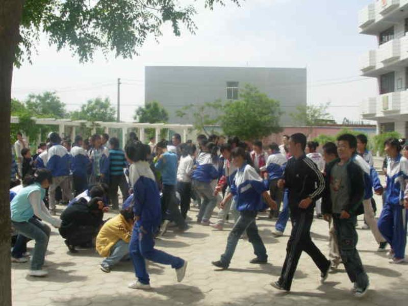 在桌子底下钻了大概有一分钟左右,老师便让我们有顺序的抱着头往下跑。同学们都跑下来之后,老师便让我们蹲在空旷的地方,用手护住头部,不要蹲在建筑物旁和树木的旁边。几个老师还现场做了被建筑物砸伤之后,如何包扎伤口,如何清理伤口。