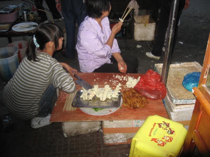 然后由一位阿姨把之前准备好的材料分类穿到一小木棒上面。