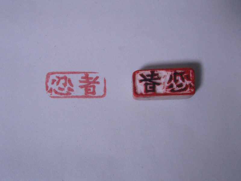 这是我的第三幅作品,它使用的是阳刻,在这块橡皮上我刻了“忍者”。“小不忍则乱大谋”。 全身黑色装束,能飞檐走壁、跳墙越城、唤雨呼风、移星换斗,使用各种奇形怪状的暗器。此形象,是我小时候所最崇拜的,使我感到特酷^_^