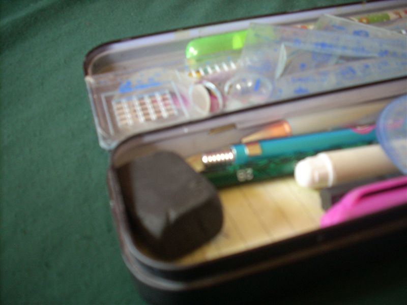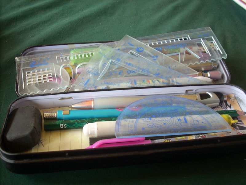 看,鼓起了大肚皮的那是什么?——文具盒,它有婀娜多姿的身材,身穿五彩花衣,漂亮极了,心胸宽阔的它,容纳了一切学习用具,并没有丝毫怨言,而是无比的幸福、快乐。