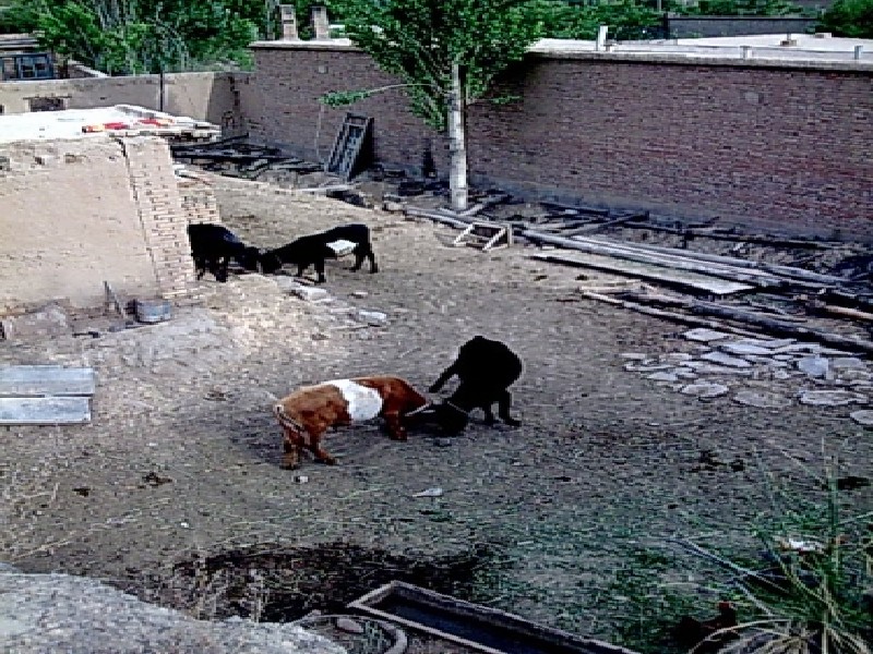 从半山腰向下眺望,一户依山而建的农家院里两对牛正在角斗,它们都奋力用自己的犄角向对方顶去,使出浑身解数想将对方顶倒,由于双方实力相当,来来回回好几个回合都没有分出胜负。