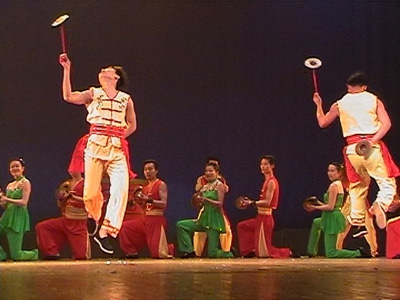 3、均衡的节奏:表演时,无论动作怎样变化,也无论延续多久,其进行的节奏,总为中速,均匀而平稳。常常是一场表演长达二、三十分钟,而铰子的敲击,始终是合着2/4的节拍,一拍一次,从容不迫。在均衡的节奏下,动作却时大时小,时起时伏,动静相济,显示出张弛和跌宕,不但没有单调平直的感觉,反而觉得别有情趣。