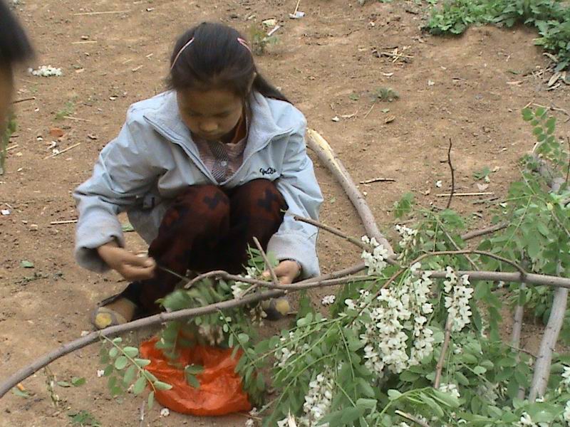 当姑父把槐树枝从树上砍下来后,那么大的树枝怎么拿呀,我们要捋到枝上的槐花必须把树枝折成小枝才行。可槐树枝上全是小刺,我的小手被扎了好几下,这时姑父从树上下来,拿起砍刀几下子就把大枝砍成小枝了。怪了,看到姑父那有力的手把小枝上的槐花给折下来,我就不懂,难道他的手就不怕扎吗?