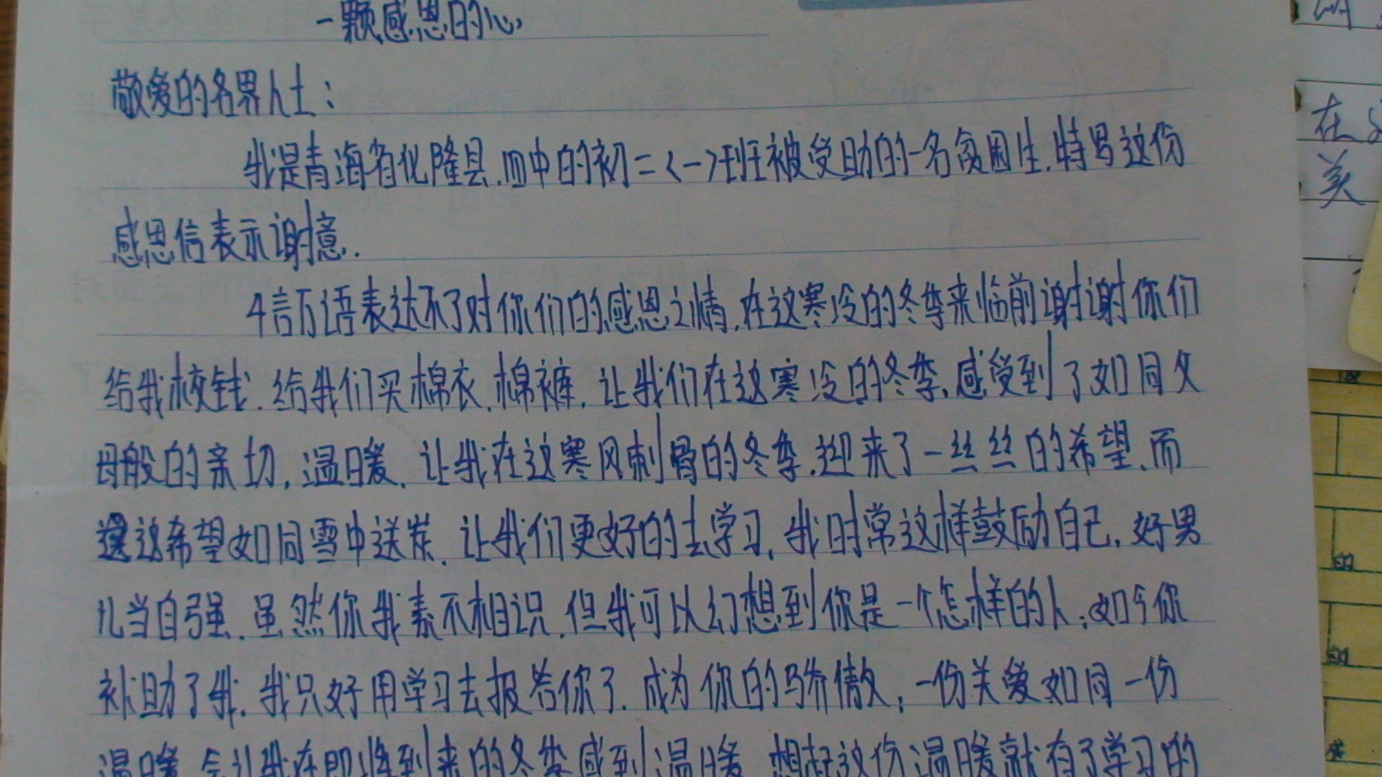 作为管理员的我,从26封感谢信中还了解到,他们都在表态度、表决心。都强烈表示:我们一定会好好学习,不让你们失望,一定为好的成绩而努力,长大以后做一个对社会有用的人。最后我们再次想您们说一声:谢谢!在这里我们衷心的希望在未来的每一天里,你们能天天开心,工作顺利!我们永远不会忘记远方的你们!