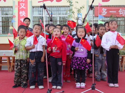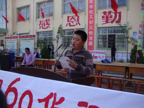 还有最后的班级合唱。参加的每一个班级都唱的十分不错,声音洪亮,感情饱满,特别是那些低年级的小弟弟小妹妹唱的非常好,动情。全场给予雷鸣般的掌声。挥洒汗水,舞动青春,热烈庆祝祖国六十华诞!让我们同祖国母亲一起豪迈前进!