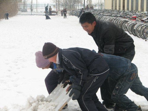 终于到学校了,我看见有些老师在扫雪,那些低年级的学生在打雪仗,玩的好开心啊,那么有意思,吸引了不少同学的眼球。