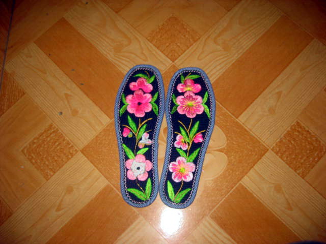 我妈妈的手可巧了,她在家闲的没事干,就拿针线开始绣鞋垫。她在家里绣了很多鞋垫,各种各样的都有。妈妈也给我绣了各式各样的鞋垫,什么牡丹花,还有许多图案是我叫不上名的。如今我家的衣柜里还有几双花鞋垫,都是妈妈绣的,妈妈曾经给外公也绣了一双鞋垫。有一次我问妈妈你的刺绣手艺从何学的?妈妈说:“这都是小时候跟外婆学的。”妈妈还说:“小时候没有布只能拿大树叶当作布来绣鞋垫,这刺绣的时候没有彩线,就拿普通线来绣。”功夫不负有心人,后来我的妈妈终于学会了刺绣。