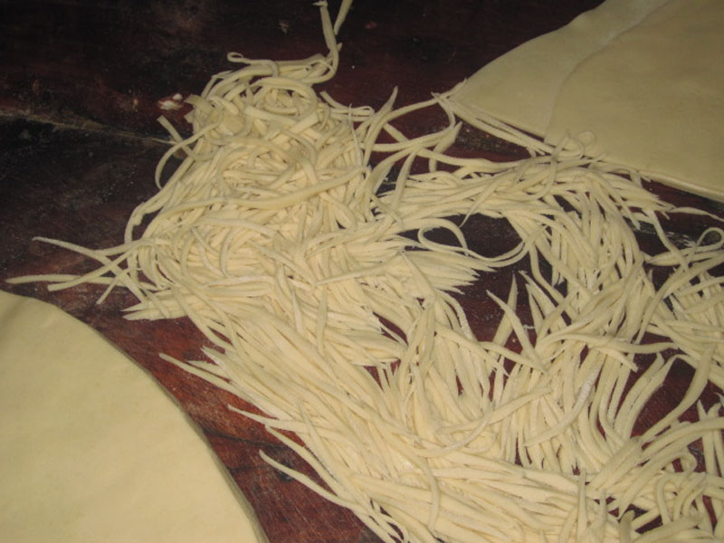 不一会那“恼人”的面就被妈妈揉的又圆又光,可谓“随心所欲”了。等将面团擀成大张圆后,再切成扇形,然后从扇角处开始切面。