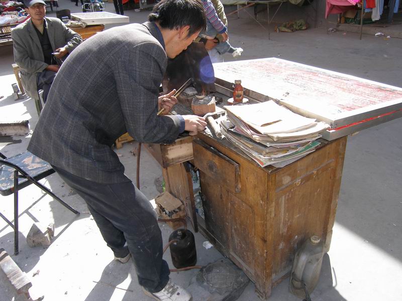 这是我们集镇上的加工金银首饰的小摊。看他忙碌的样子,正专心的给顾客们做耳环等等类类的金银首饰。小桌上的一垒书都是他给顾客们的样本。