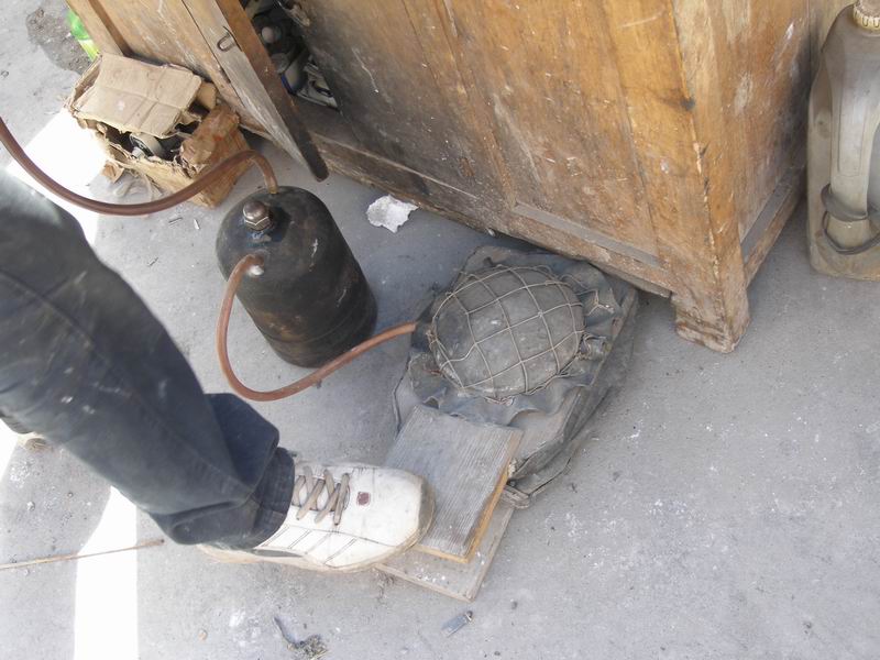 这是用来融化金银的工具皮老虎,银匠用脚踏着皮老虎,使它喷出火来把金子或银子熔化以后再做成耳环等首饰。