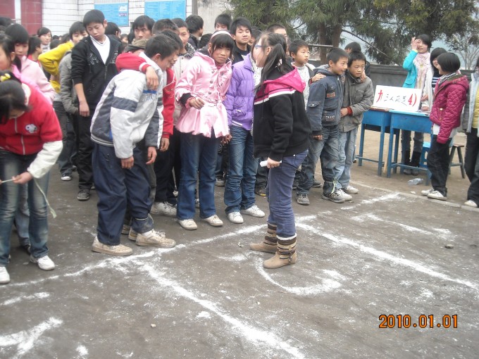 这里是“两人三足”,顾名思义,就是两个人用三只脚走路。先把一个人的右脚和另一个人的左脚绑在一起,裁判员一声令下,各组队员,各奔前程,有的队员,走得太快了,结果一起摔在了地上;还有的队员,步履不一致, 也一起倒在了地上。而有的人,就不同了,看!这组队员表现的非常沉稳,踏实,一步一步,配合的非常默契,最终品尝到了胜利的果实,两人各得了一张奖票,欢天喜地,又携手参加下一个游戏去了。这种游戏,考验同学们的默契,增强彼此之间的友谊,培养了个人的集体意识。