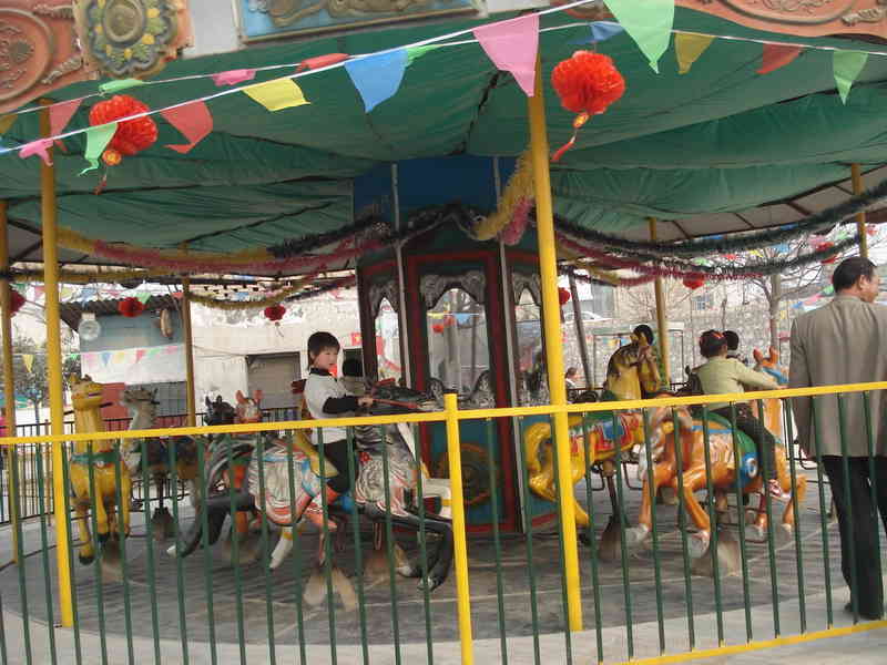 然后,我们又来到旋转木马前,我问坐一阵旋转木马多少钱,阿姨答:五元钱。看见木马上一个个喜气洋洋的孩子,我就“囔囔”着让妈妈付钱。妈妈说太贵了,我们玩别的吧?我说不行、就玩这个。妈妈看我不太高兴,只能说:好吧。我急忙跑到旋转木马前,骑在了木马身上。我真是太高兴了!
