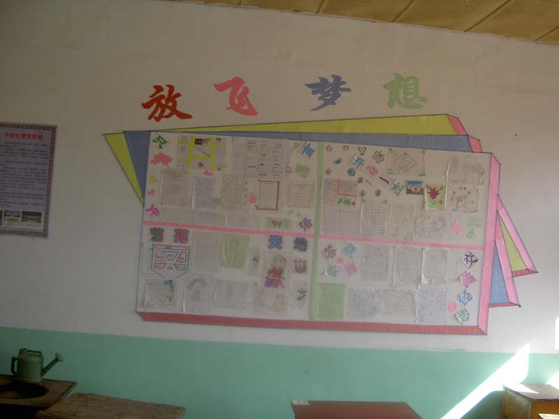 在班级的后面,是同学们的“小乐园”。这里是展示同学们文艺的小舞台,这就是我们班的学习园地,在它的上面有四个醒目的大字“放飞梦想”。这四个字象征着每个同学都有各自的梦想,他们会为他们的梦想奋斗!