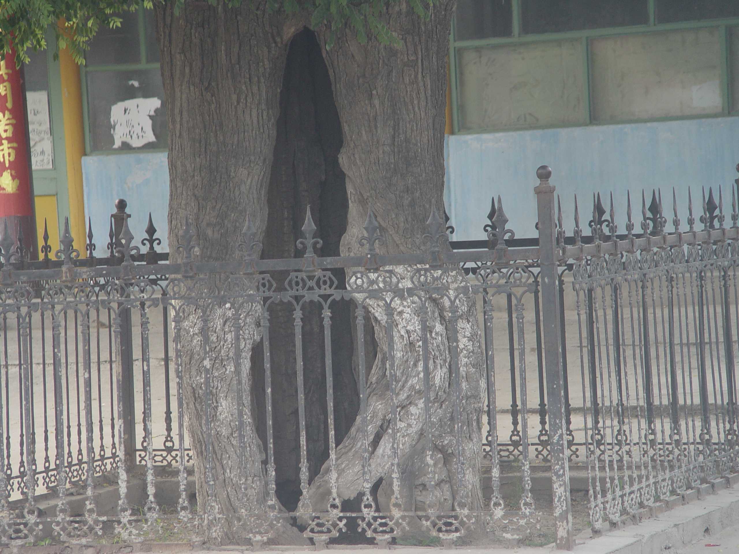 据说这棵树是明末清初种下的。现在,这棵树是空心的。由于以前人们对古树的保护意识差,小孩又淘气,还烧过着树呢。现在,人们对它的保护意识增强了,在树周围圈上了一圈铁栅栏。