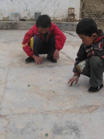 由于参与的人比较多,所以玩耍时也有一定顺序。同样首先也是“头家”,其次是“二家……”。“头家”将自己的玻璃球放在地上不动,瞄准一方的玻璃球,用力弹去。如果对方的被击中,那么那个玻璃球就是你的战利品。然后再去瞄准下一个,再弹。如果弹不中,就有下一位继续。