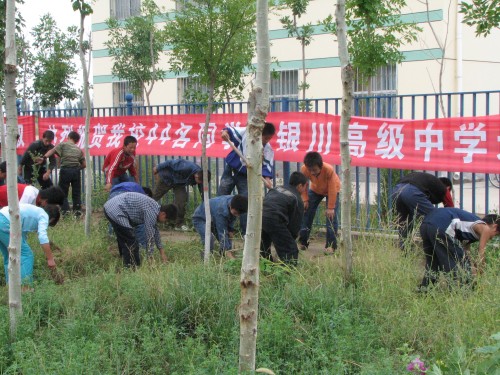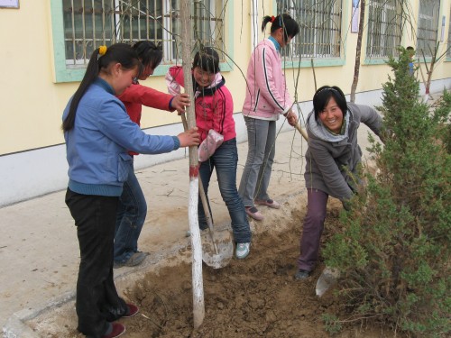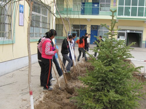 这天,我们兴致勃勃地抗了几棵树,提了几桶水,再拿上几把铁锹,我们的工具算是拿够了。等走到预定地点,我们早已是满头大汗了,但看看这贫瘠的土地上棵棵参天拔地的巨树,我们的心又得到了安慰,想想再苦再累也是值得的。