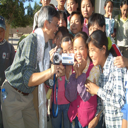 陈天雄先生和我校学生在一起,大家从来没有见过这样的机器,非常新奇,都跑到跟前,去看看里面的画面。