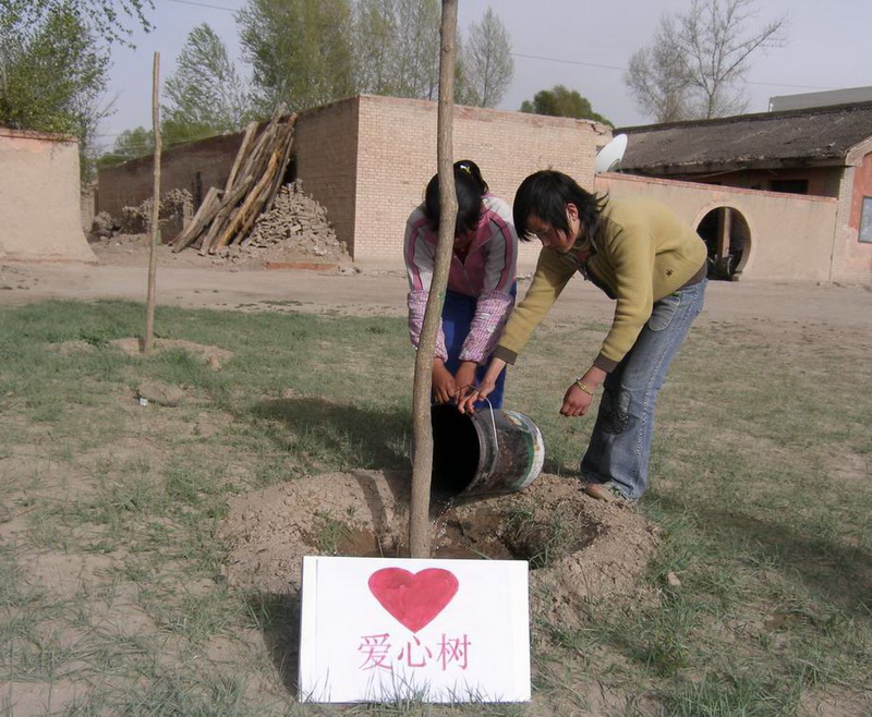 这张照片是我们前年栽的树木,同学们在给树木浇水。为什么我们把它叫爱心树木,是因为通过栽树来资助我们,通过劳动获得帮助,培养了我们奋斗拼搏的精神。