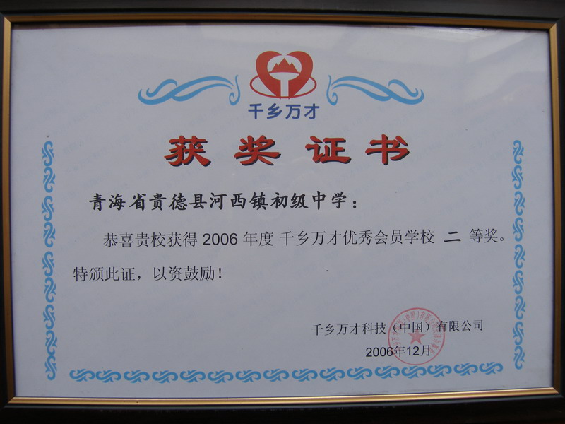 这是我们学校在2006年度优秀会员学校评比中获二等奖的奖状。这次取得的成绩,是我们学校的校长大力支持和管理员老师的努力是分不开的。