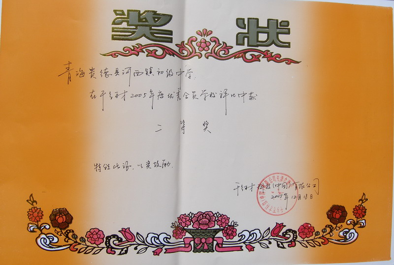 这是我们学校在2005年度优秀会员学校评比中获二等奖的奖状。不要小瞧这个二等奖,但它是用我们好多努力换来得,是来之不宜的。
