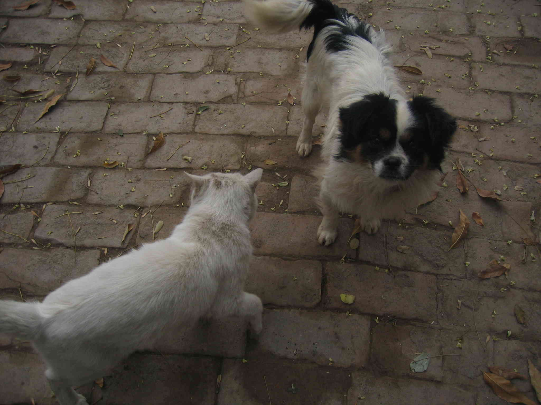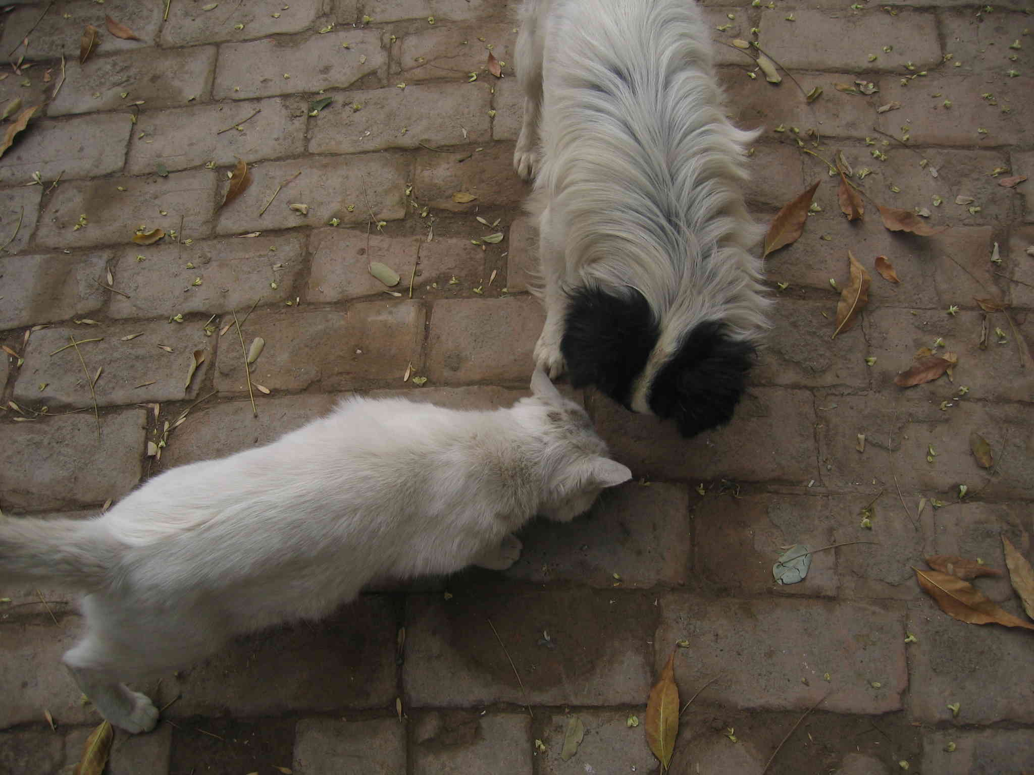 "喵喵喵"我拿着馒头叫唤猫,不料猫和狗居然一起跑过来。两个紧贴着身子尾巴都翘的老高,小狗对你伸着舌头,圆溜溜的眼睛里充满了渴望,扔下一块馒头·。你肯定会想它们两个会争抢着。呵呵 才不是呢,如果狗先吃到,猫咪就会蹲在一旁朝你叫。如果猫先吃到,狗会很顽皮的摇着尾巴等猫咪吃完再一块叫唤,要么一只吃完余下一点另一只再享用。这两只家伙真有趣啊!!!!