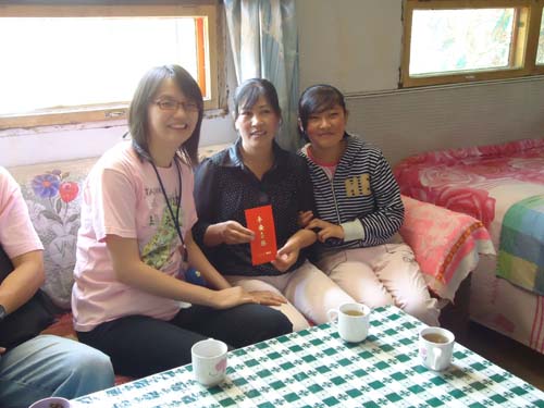 “把爱留在这里,能帮就多帮点”,这次活动中给学校捐助20台复读机,价值达2000元。28、29日在学校和学生一起活动,30日台中水湳传爱基金的老师们走访了受7月6日洪灾严重的华启寿同学家,同他的爷爷奶奶亲切交谈,送去慰问金300元,又走访了吴静蓉、李万云、王秀芳三位贫困学生家庭。吴静蓉同学家中父亲出外务工,而且身患腰椎病,家中母亲操持着一切,传爱基金的老师们送去200元的慰问金。李万云同学有一个哥哥今年刚考入大学在家等待录取通知书,父亲去世九年多了,母亲一人拉扯着两个孩子,在本村的网围栏公司打工,每天只有二、三十元的收入,家里的农活还是母亲一人承担,传爱基金的老师们送去500元的慰问金。王秀芳同学父亲到玉树打工,母亲有病还要照顾家里的一切农活,台中水湳传爱基金的老师们送去300元的捐助红包。另外,台中水湳传爱基金从2008年开始每学期为学校25名贫困学生提供10000元的助学金,已经延续了二年,总共捐助数额达40000元,明年将会继续提供奖学金。