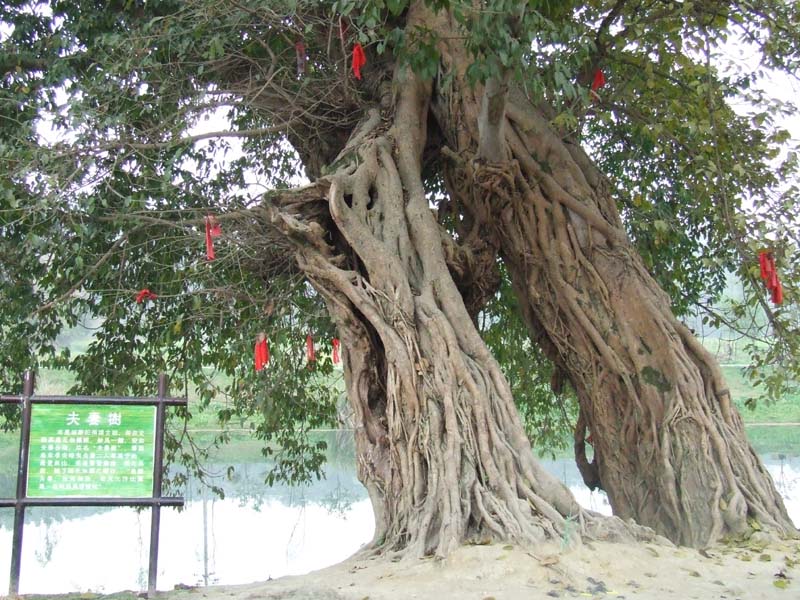 在临溪河岸,有将近十棵的大古榕,它们日日夜夜站立在临溪河岸,犹如威风凛凛的将军日日夜夜守护着临溪人民的安全.这些大古榕长的奇形怪状,有的像恐龙,有的像仙女……于是临溪人们给它们取了名字,什么”恐龙树”,”仙女树”……最奇的要数”夫妻树”了,它是由两棵大榕树在半空中合长成为一棵大榕树,宛如一对夫妻抱在了一起,”夫妻树”也由此得名.传说,这棵奇树是古代两个恩爱无比的夫妻死后紧紧抱住对方化成的.这棵树很大,树杆粗的六七个人才能合抱住,枝繁叶茂,从树下往上看,只见的稀稀的几个小光点在一闪一闪的.从上往下看,宛如一块庞大碧绿的翡翠.这棵树保佑着西来古镇风调雨顺.
