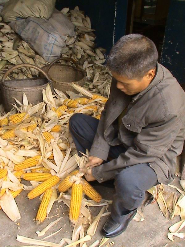 当我们把那一个个沉甸甸的玉米收回家后,从来不敢把它倒在露天底下,因为如果天一下雨,这些玉米棒子最怕淋雨了,稍为一淋雨,它的顶端的玉米粒就会发芽、变霉。所以每当扳完玉米后,我们就将它倒得满屋子都是,抓紧时间种完麦子,全家就会挤时间剥玉米。