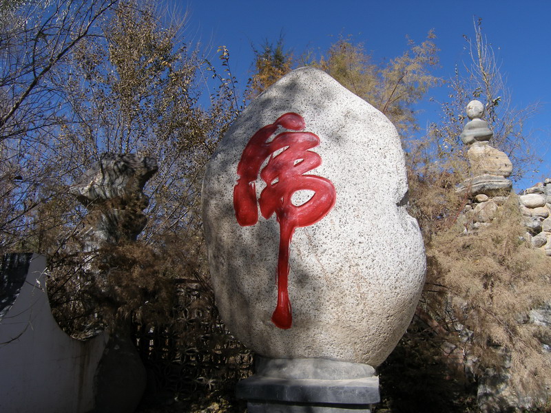 它是一个圆形的奇石,上面刻有一个红色的“虎”。它好像昂首挺胸。