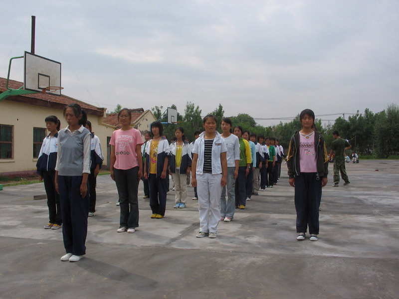 男生和女生分开站在两头,要进行一番较量,只听教官一声口令:"军姿预备!"大家全部双腿并拢,手指的中指紧贴裤缝,挺胸抬头,目视前方,操场上一片安静。