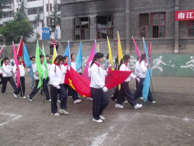 下面是入场式,国旗走在最前面,接着是“沙河中学”校牌,后面是第41届冬季田径运动会会徽,之后是彩旗队,最后是各班运动员依次入场。