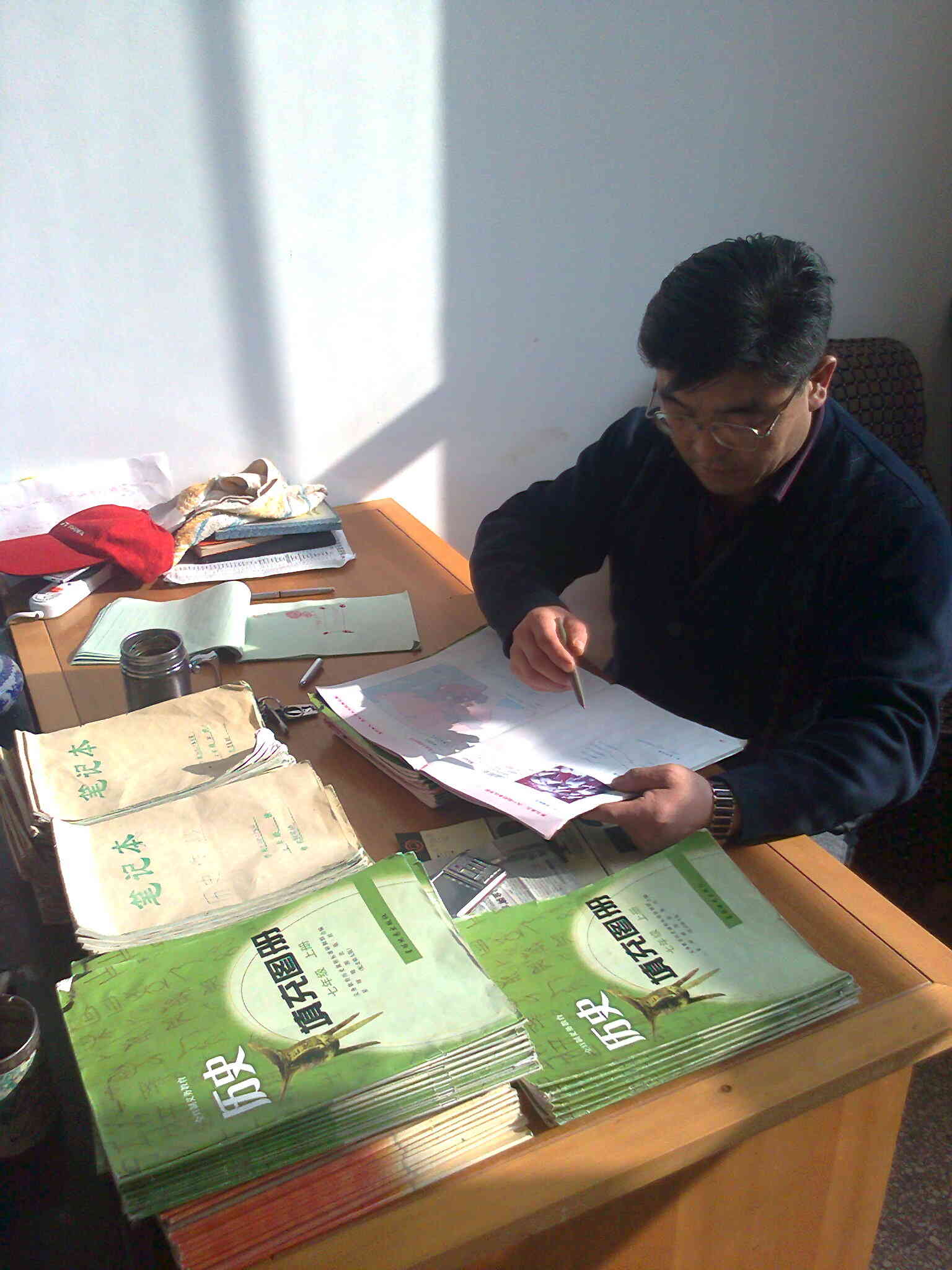 历史老师有30年的教龄了,我们的父母都是他的学生,可以说是"桃李满家乡"了,他热爱书法,每当课余闲暇时总是在写字,他写的字有的铁骨铮铮,有的龙飞凤舞,每当写完一副作品,总要仔细端详揣摩半天,看看哪个字写的不好,哪个字写的好。