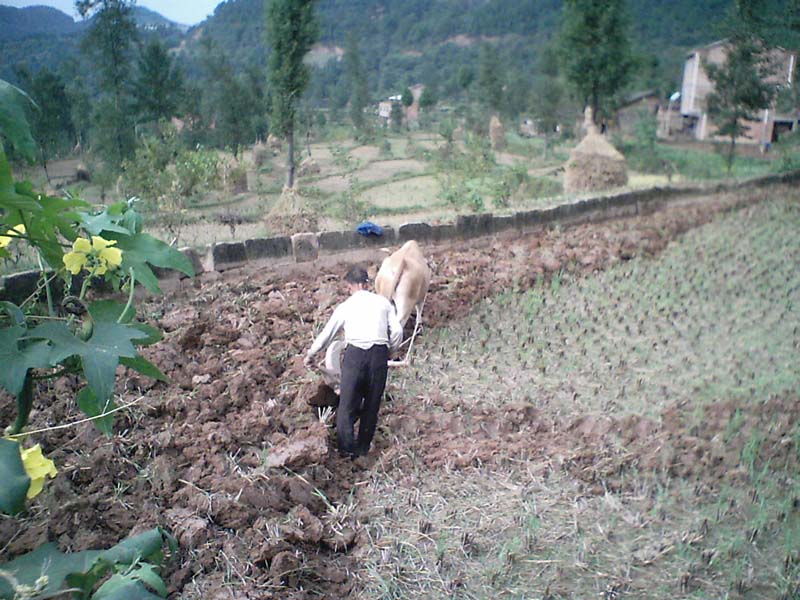 这几天,正是农忙时节,家家户户都忙着栽菜,在栽菜的时候必须把田里的土翻松,这样菜栽了才会长的好。在我们这里随时都可以看到有人赶着牛去翻土。