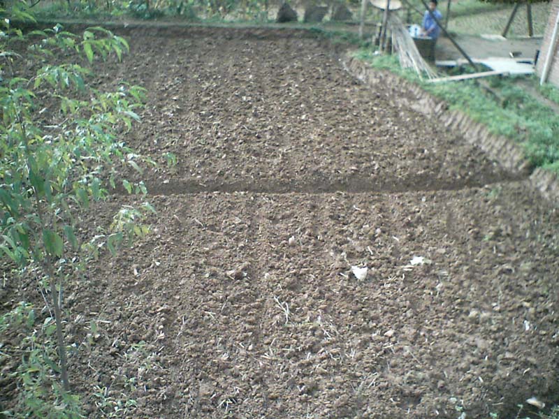 把土块变小以后,就是用锄头把田里的土变成一行一行的,这时就可把菜栽到这一行一行的凸的部分。