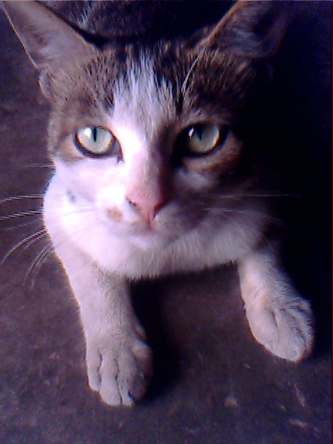 大眼睛,白鼻子,竖立着两只耳朵,花白的毛发和背上的那点黄。这就是我的宠物猫——小白。