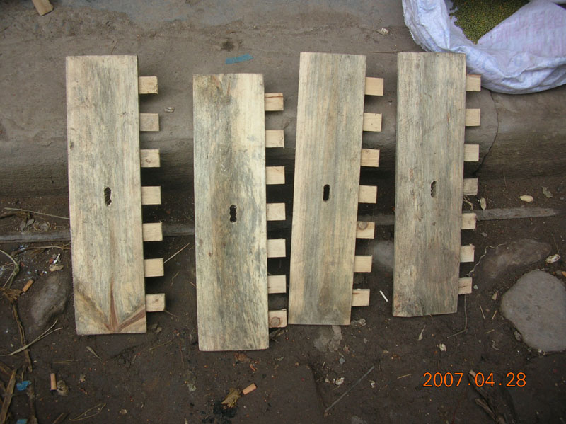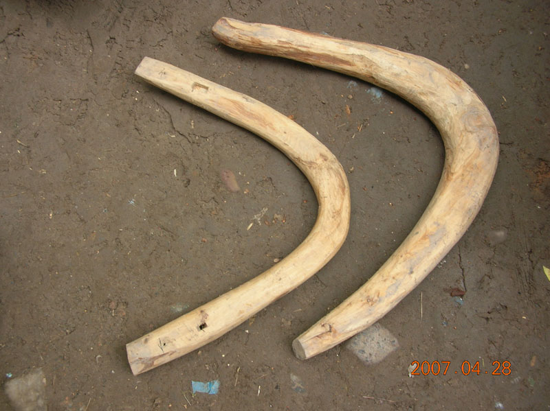 这个是咱们乡下最常见的农用工具。它的作用是在牛耕地的时候束缚牛以达到能更好的让牛与犁头连接好。做这样一个工具很简单,它的原材料是柏树木。用斧头将它砍成U的形状便可以了。