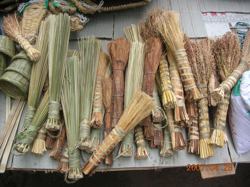 扫扫是厨房涮洗用的工具,在农村厨房是非常常见的。它的制作相对于其它的几样是简单的没法再简单了。它需要一些高粱的茎和青篾。还有一种是用竹芊制成,将竹芊削成很细的竹丝,然后再捆扎成把便可以了。