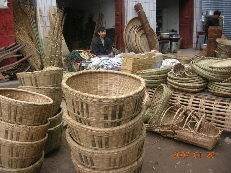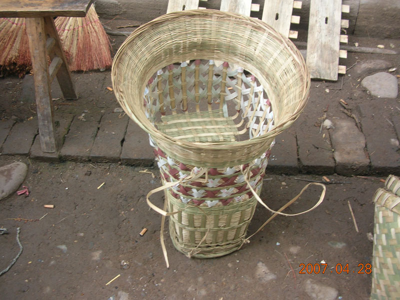 这个背篓很特别吧!它是用来背小孩子的。通常情况下,孩子可以站在里面,也可以坐在里面。编制这样一个背篓需要一些工夫呢!首先要选上好的青篾,然后再细细地编好,里面还有一些极为难的编花呢!不错吧!我小时侯就尝到过它的甜头呢!