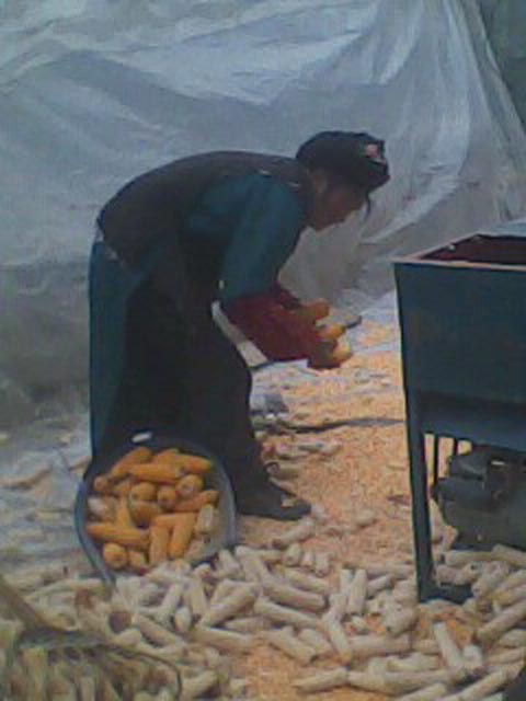 我老妈也不例外,她始终跟我爸站在同一线,她总是将落下来的玉米拾起来放在机器口处,一直都做着同样的动作,不是拾落下的玉米就是用手刨已打好的了玉米仔。看她弓着腰劳动了半天,我要求我来帮妈妈做,可她说:“没关系的,明天就要走了,你做轻点的活!这儿我来就好了。”当我听到老妈那样说,我的眼泪情不自禁地一次流了出来。