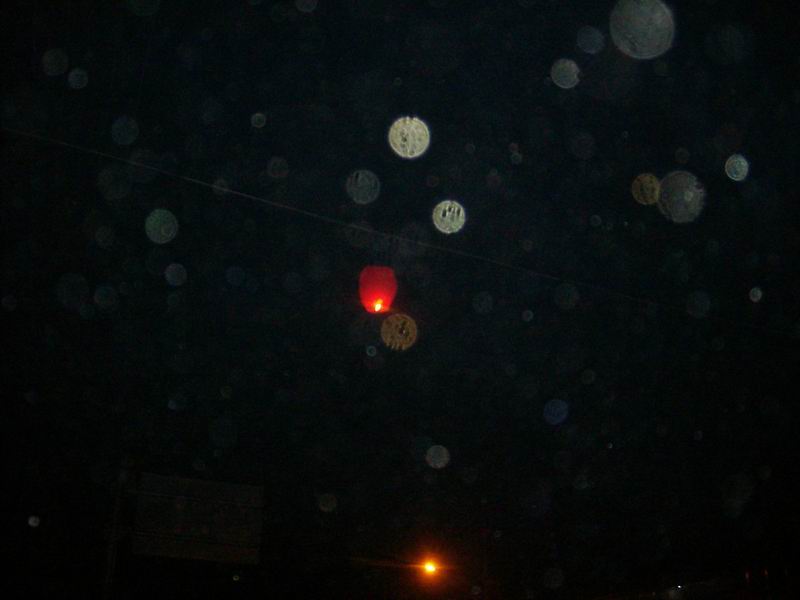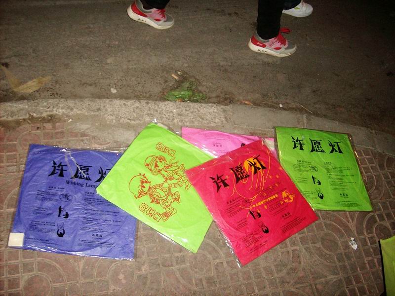 开始放了,有几个叔叔教我们放,先把灯陈开,举起来,另一个人把下面的蜡油棉球点着,等到气把灯充得鼓鼓的,然后放开,灯就会飞起来了。第一次我们失败了,叔叔说要等到气充满了,感觉很轻,向上飘再放手,我们又重试了一次,这次按叔叔说的,真的飞了起来。