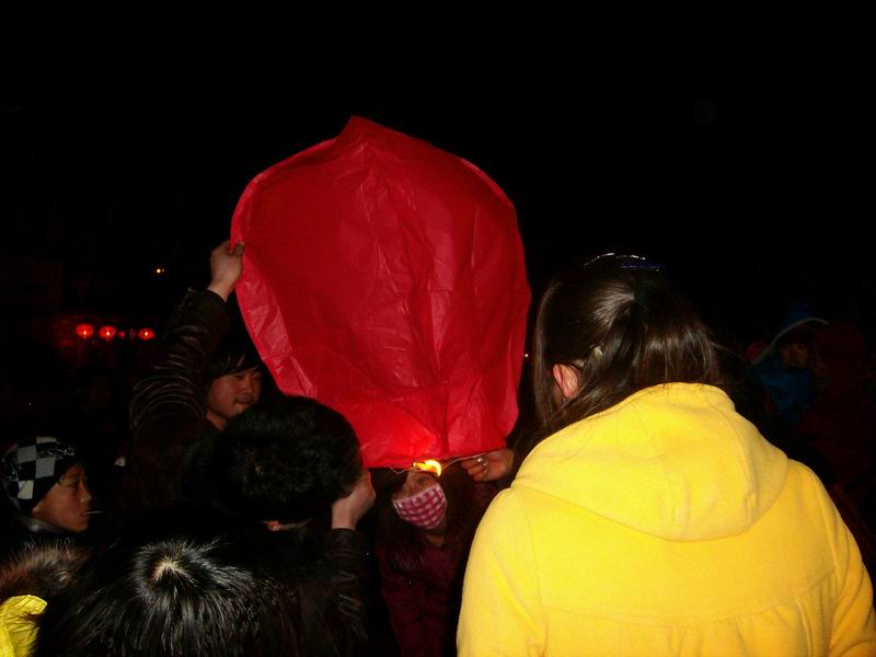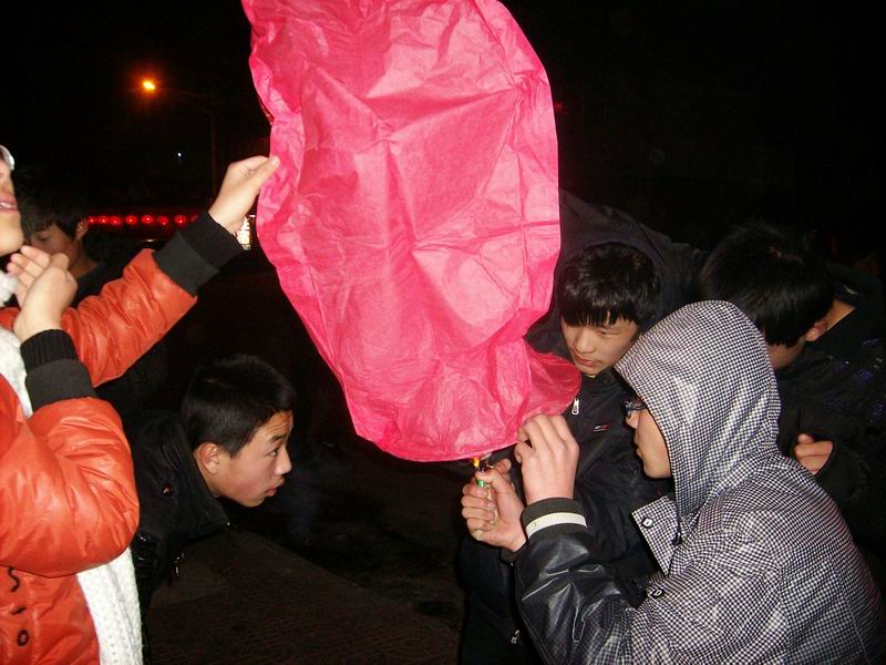 开始放了,有几个叔叔教我们放,先把灯撑开,举起来,另一个人把下面的蜡油棉球点着,等到气把灯充得鼓鼓的,然后放开,灯就会飞起来了。第一次我们失败了,叔叔说要等到气充满了,感觉很轻,向上飘再放手,我们又重试了一次,这次按叔叔说的,真的飞了起来。