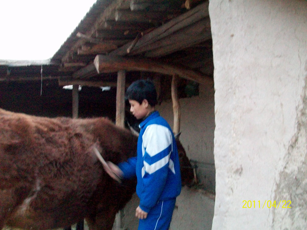 一天,我刚从学校回来,我的牛朋友就"哞哞"的叫个不停。最先,我还以为它是饿了呢,就连忙找来草给他。让我没想到的是他竟然连看也不看一眼。我疑惑了:他难道不饿吗?这时,我灵机一动,给它挠起了痒痒。这次,他乖乖的让我给他挠痒痒。我和他已有了五年的感情了。记得它出生的那一年我家正在盖房子,我们大家都为他的到来感到无比高兴。