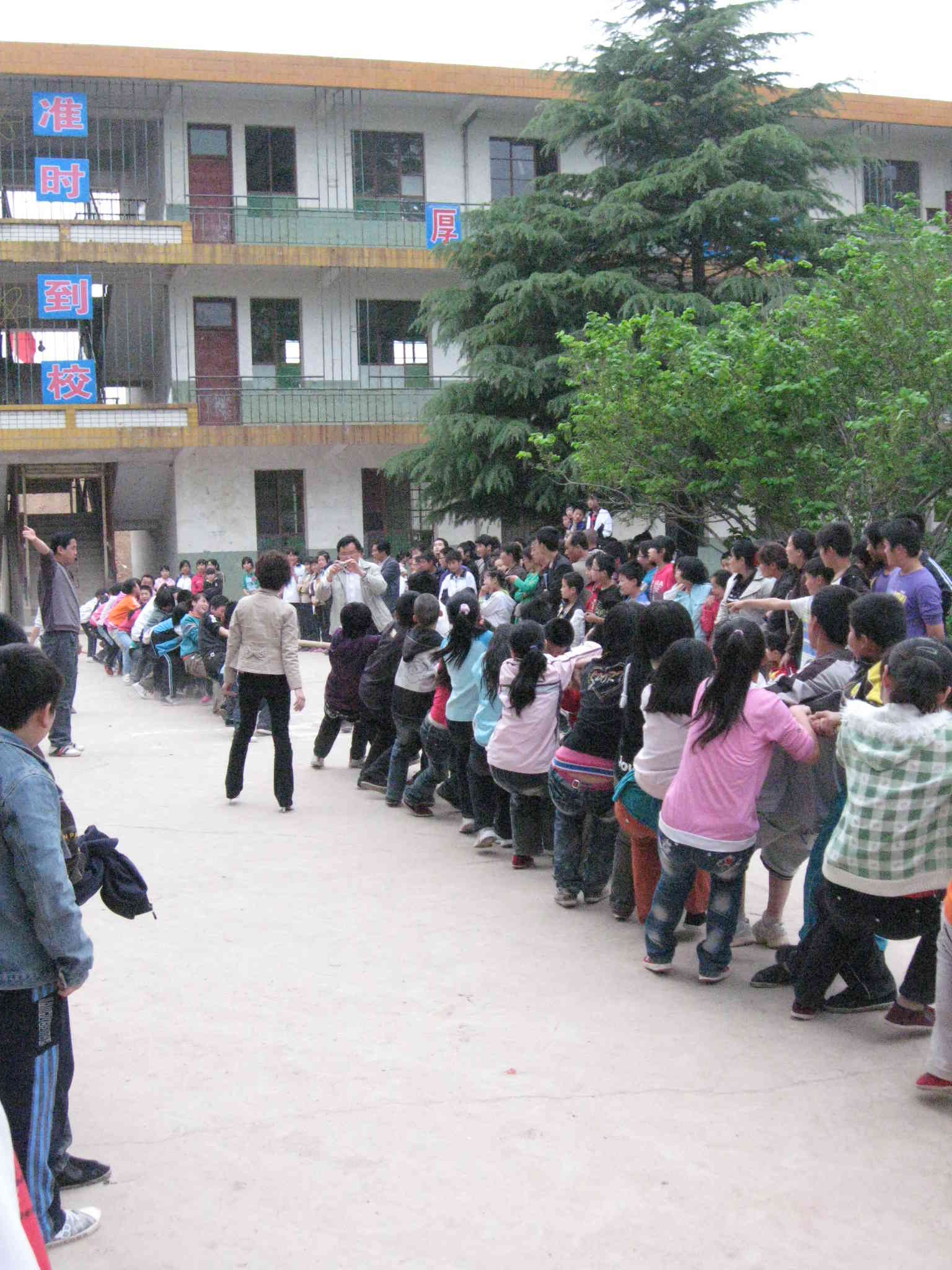 “嘟------"比赛的哨声吹响了,先是一年级的1班和2班比,只见同学们个个脸涨得通红,使出了吃奶的劲向后拉,两边的各班拉拉队的加油声也震耳欲聋,最终2班战胜了1班。接下来就该我们上场了,我们15名女生来到场地抓起又粗又长的绳子时,心里可紧张了,我觉得心里在咚咚的跳,身子不由得颤动起来,我心里说:不要紧张,一定会战胜对手的。这时,我们的班主任走到我们跟前说:不要紧张,身子向后倾斜,屁股朝下蹲着,重心朝下,两腿向前蹬直,齐心协力,劲往一处使!听老师这么一说,我们心里都有了劲了,做好了最好的姿势,两眼盯着前方,注意听裁判老师发口令。