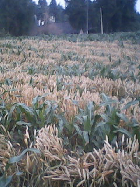 农田里的玉米苗经过一个多月的生长,粗壮的枝干要高出待收的麦子一个头呢,农田里到处都是绿和黄。绿得逼人,黄得耀眼。