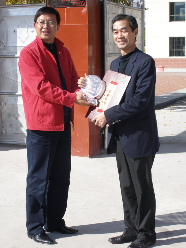 许县长与爱心人士同在一起拿着荣誉证书 在我们的新教学楼的门前合的影。