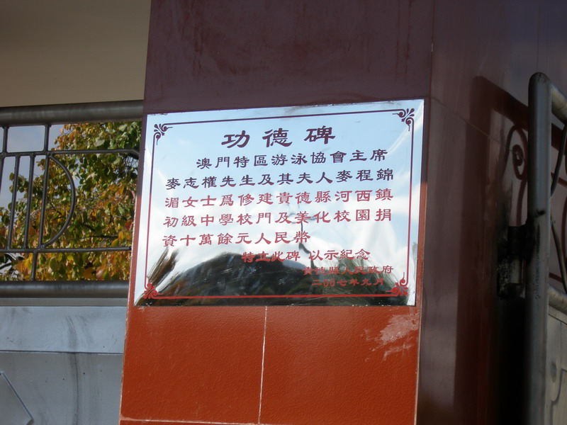 这是贴在我校新校门上的功德碑,它记录着爱心人士们所捐赠了什么。 有的人们会认为不就是捐了一座学校,没什么了不起的;但我认为捐赠这个学校的人是富有爱心的,是了不起的。