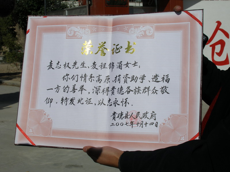 这是贵德县人民政府发给麦志权先生和麦程锦湄女士的荣誉证书。 它就如我们学校的奖状一样会挂在最显眼的地方。